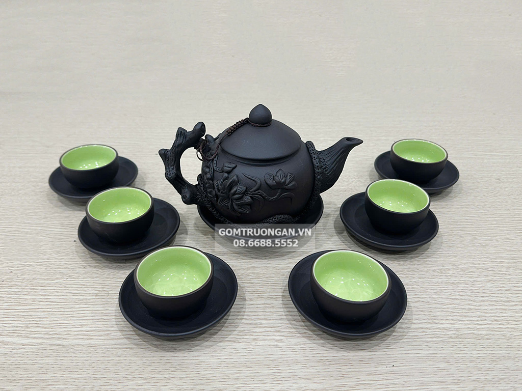 Bộ ấm chén tử sa đen đắp nổi hoa sen lòng xanh với vẻ đẹp thẩm mỹ cùng chất lượng cao cấp có tính ứng dụng cao trong cuộc sống như: bộ dụng cụ pha trà nhập hàng , vật trang trí không gian theo yêu cầu , món quà tặng quà biếu...