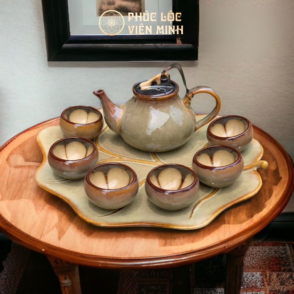 Bộ Ấm Chén Hồ Lô Gấm Khay Lá Bỏng Cao Cấp Gốm Sứ Bát Tràng - Phúc Lộc Viên Minh