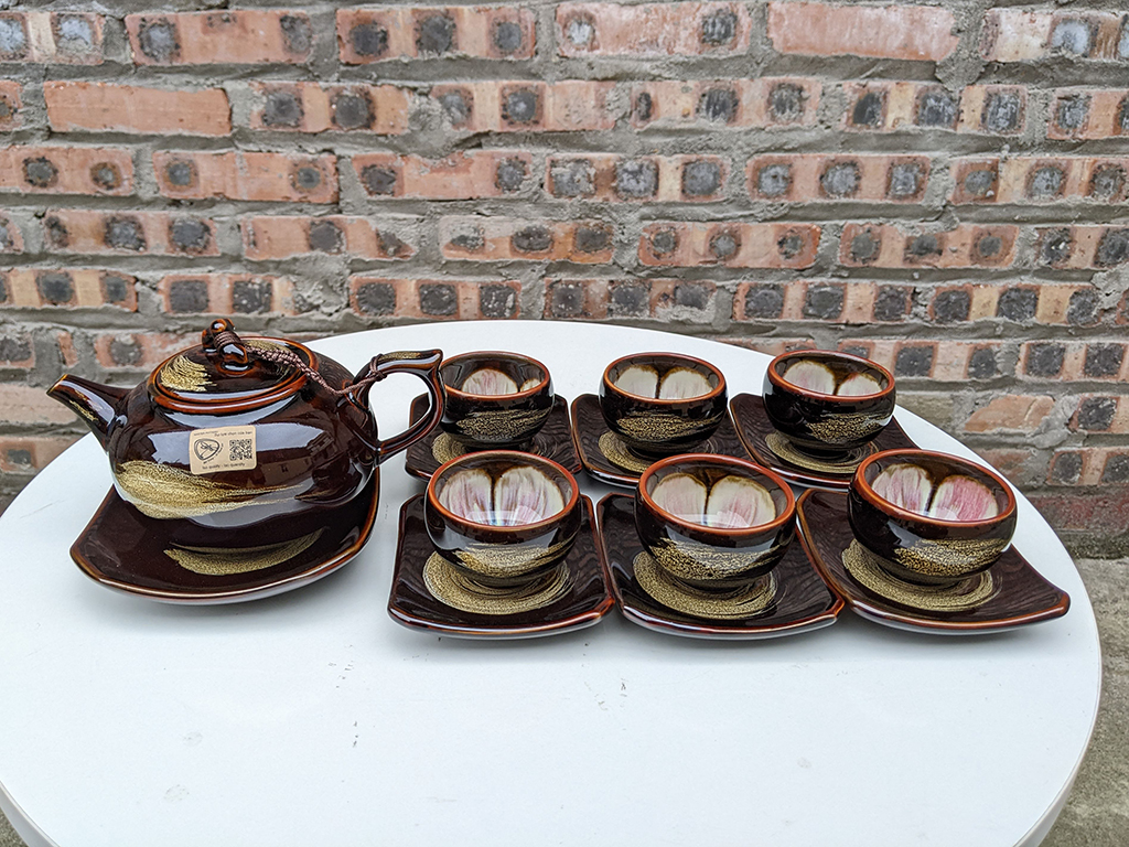 Bộ ấm chén sở hữu màu men hỏa biến nâu mật với những chấm li ti xen kẽ tạo nên vẻ đẹp sang trọng tốt nhất , cuốn hút giao hàng . giá rẻ Khi đặt nơi có nhiều ánh sáng bề mặt men nhẵn mịn Thái Lan , sáng bóng tạo hiệu ứng đẹp mắt tăng thêm vẻ đẹp cùng sự biến ảo độc đáo của dòng men hỏa biến do chính nghệ nhân gốm Bát Tràng làm ra.