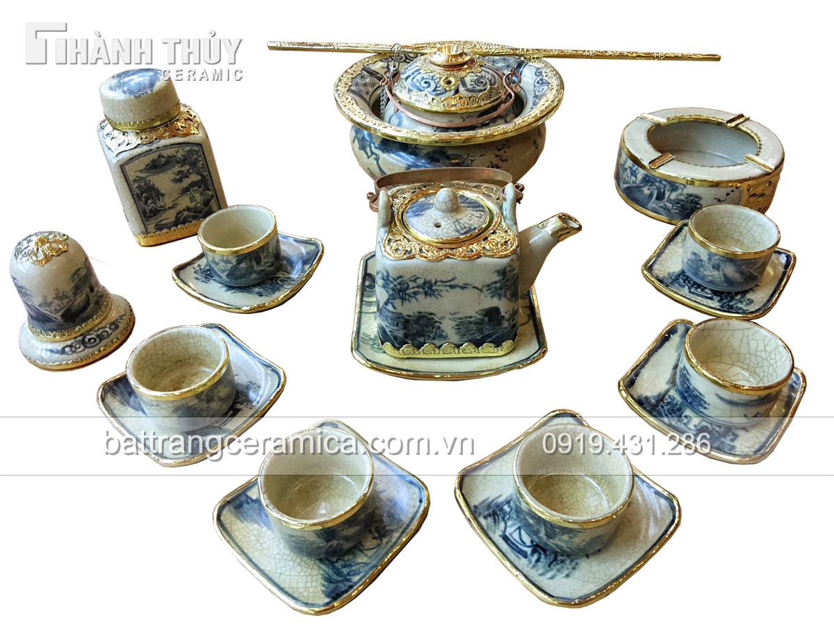 6 chén cao 4 cm đường kính 4cm ,7 đĩa vuông kê,1 ống tăm cao 10cm ,1 hộp chè cao 10cm,1 gạt tàn và 1 điiếu bát(bát cao 10 rộng 20,điiếu cao 12 rộng 10cm)