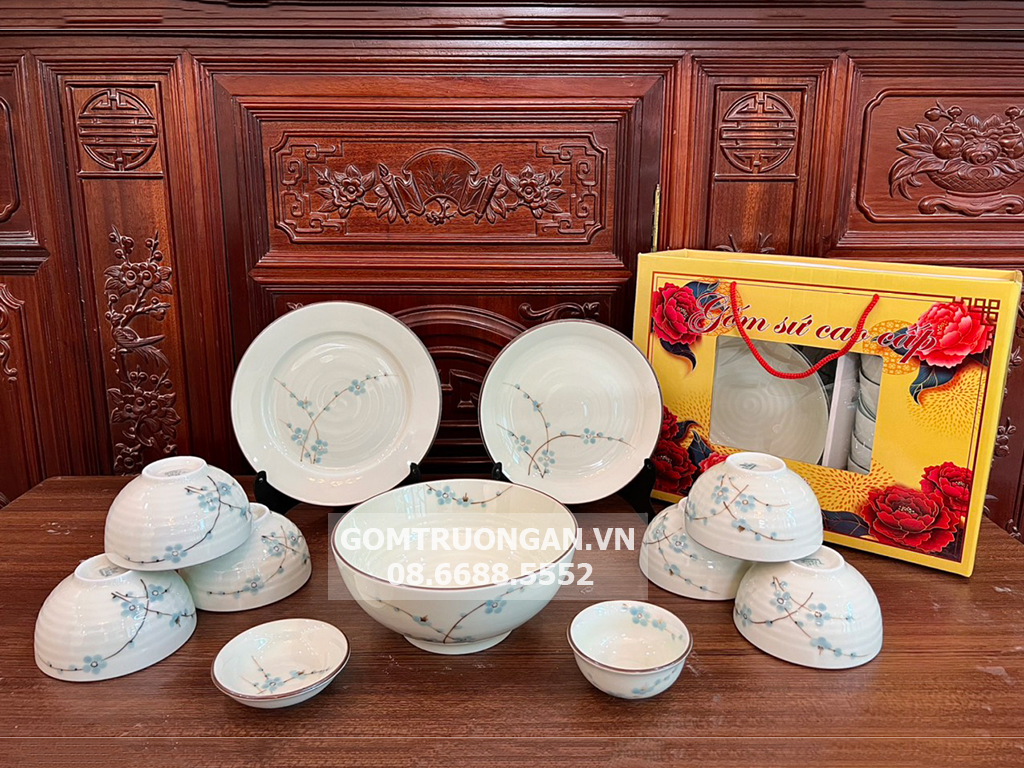 | Sản phẩm bao gồm | 6 bát cơm,1 bát mắm, 1 đĩa gia vị, 1 bát tô, 2 đĩa đựng thức ăn,1 hộp xốp sang trọng |