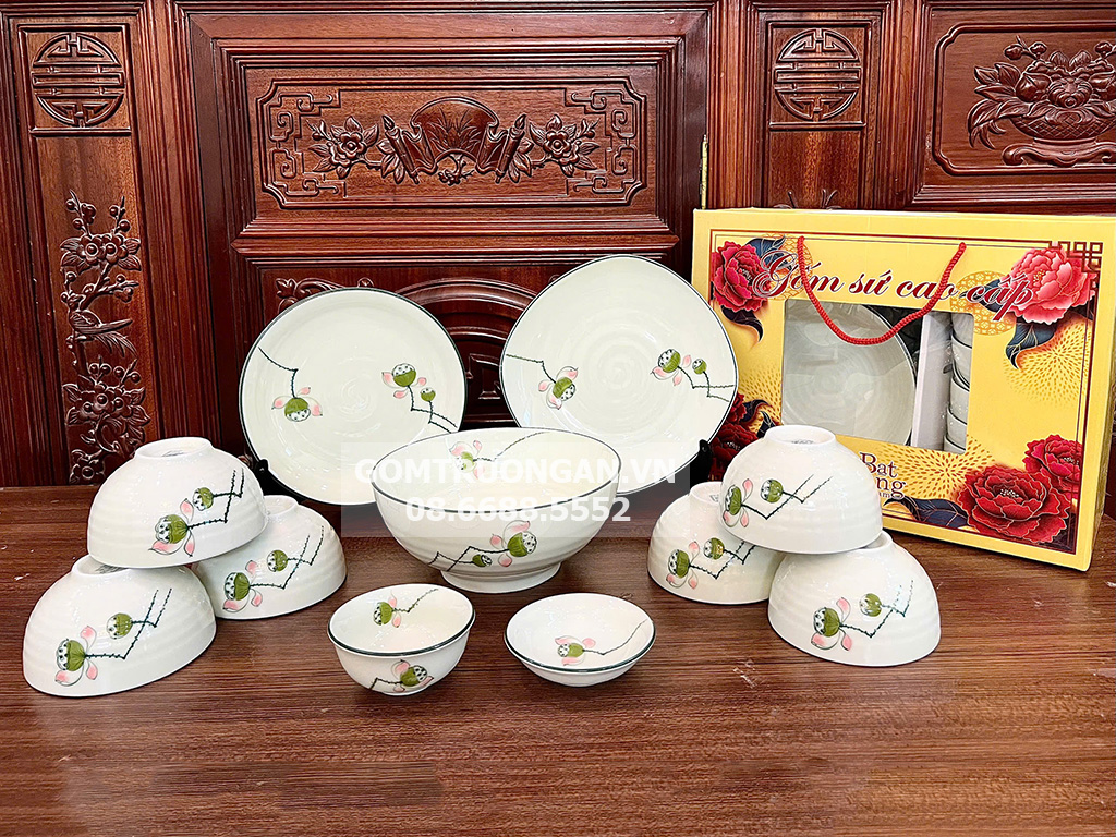 | Sản phẩm bao gồm | 6 bát cơm,1 bát mắm, 1 đĩa gia vị, 1 bát tô, 2 đĩa đựng thức ăn,1 hộp xốp sang trọng |