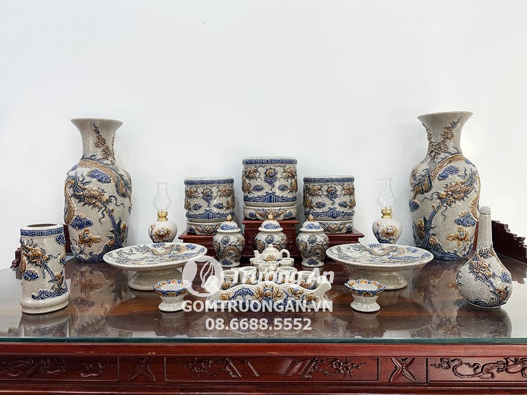 2 lọ lộc bình 50cm lấy hàng , 3 bát hương, 3 đế sứ bát hương sửa chữa , 3 chóe cao 17cm sản xuất , 1 kỷ chén 5 ngai, 2 mâm bồng dịch vụ , 1 nậm rượu S2, 1 ống hương S1, 2 đèn dầu, 1 chân nến xưởng , 1 bộ trà 5 chén |