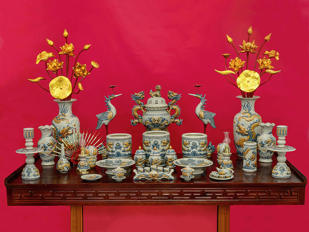Ban thờ mang ý nghĩa là sự trọn vẹn thanh toán , đầy đủ của một gia đình ở đâu , là sợi dây kết nối giữa quá khứ và hiện tại thể hiện lòng biết ơn tổng hợp , sự tôn kính vệ sinh , hiếu thảo của con cháu đến tổ tiên đẹp . Bởi vậy Gốm Bát Tràng Trường An xin giới thiệu đến khách hàng Bộ đồ thờ Bát Tràng ngũ sự men rạn đắp nổi rồng 2m17 đầy đủ với vẻ đẹp hoàn hảo phù hợp với văn hóa gia đình Việt.