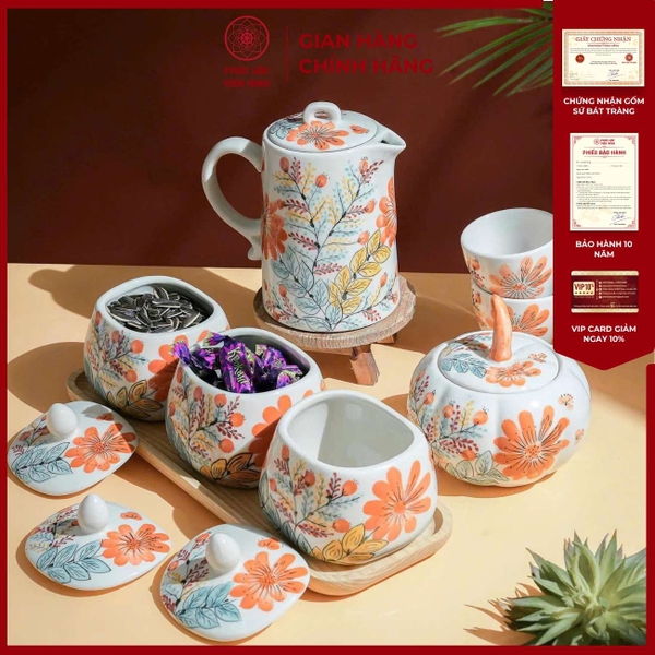 Bộ Hũ Mứt Họa Tiết Hoa Cúc Cam Gốm Sứ Bát Tràng - Phúc Lộc Viên Minh