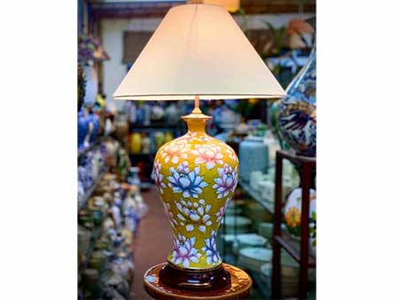 Đèn ngủ bằng gốm vẽ hoa sen nền vàng trang trí phòng khách cao cấp