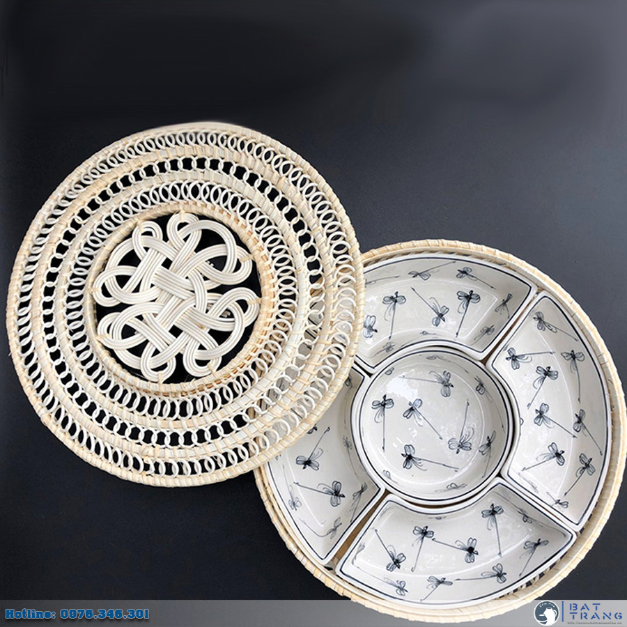 Khay mứt gốm sứ Bát Tràng khay mây vẽ chuồn xanh