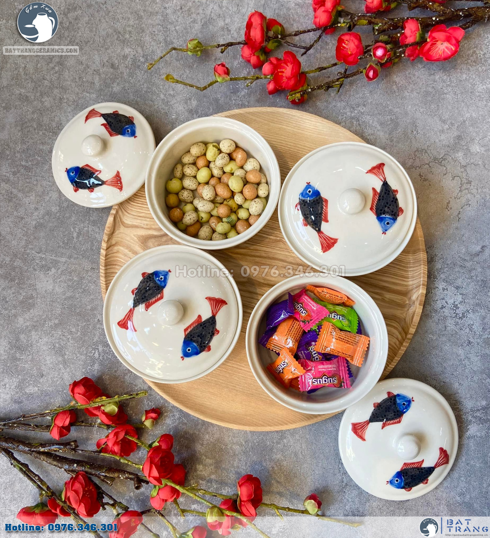 Cửa hàng Gốm Sứ Bát Tràng (Gốm Xưa) xin giới thiệu tới các bạn bộ sản phẩm Khay đựng mứt tết bằng gốm sứ,vẽ song ngư,khay gỗ cao cấp lừa đảo , độc đáo.