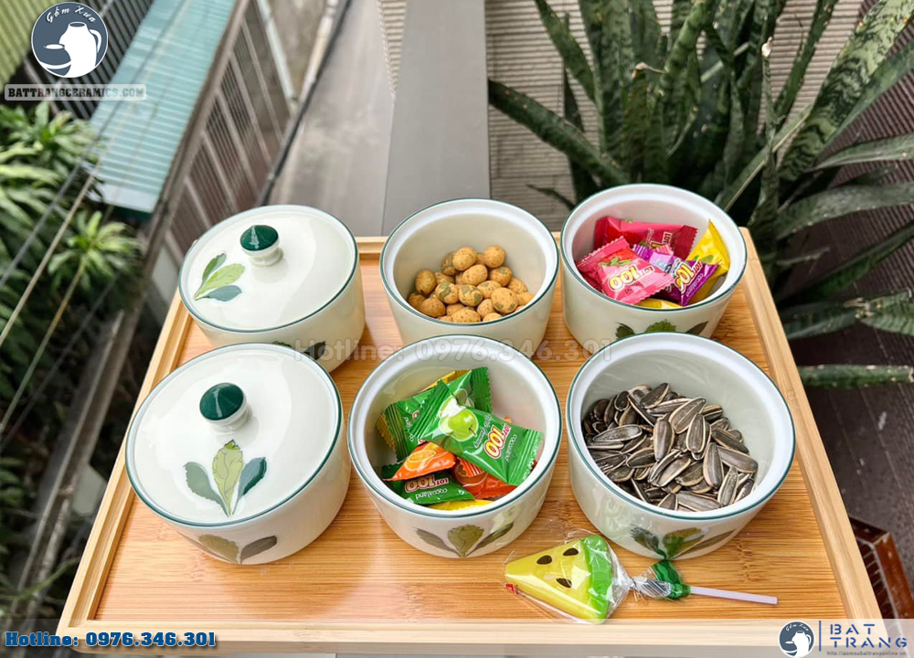 Cửa hàng Gốm Sứ Bát Tràng (Gốm Xưa) xin giới thiệu tới các bạn bộ sản phẩm Khay đựng mứt tết gốm sứ vẽ lá xanh dáng trụ danh sách , khay gỗ cao cấp chợ , độc đáo.