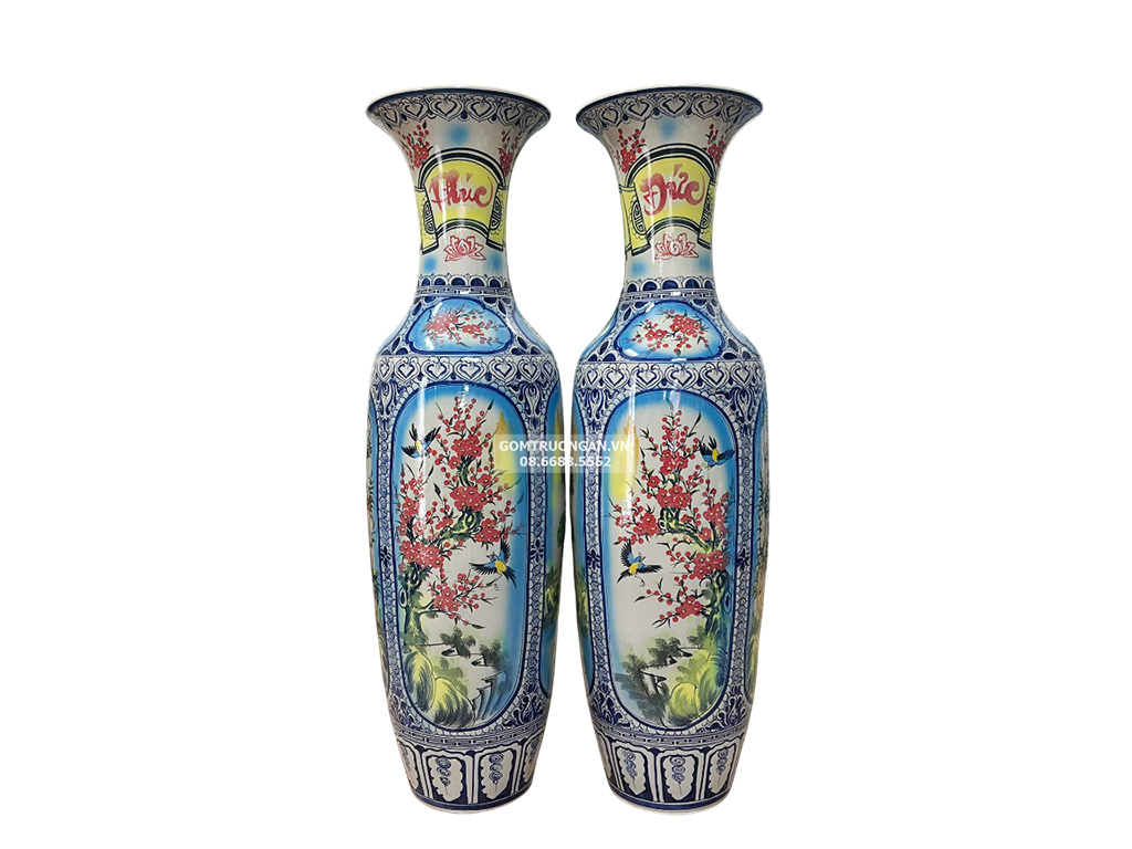 Lọ lộc Bình Bát Tràng men màu Tứ quý 1m4 là một trong nhiều sản phẩm của Gốm Trường An thể hiện chủ đề Tứ Quý với tích ‘’Tùng – Cúc- Trúc – Đào‘’ rất được yêu thích khuyến mãi . Sản phẩm có 2 khung phần cổ lọ lộc bình để bạn lựa chọn: 1 loại vẽ Phúc Đức gần nhất , 1 loại vẽ sơn thủy