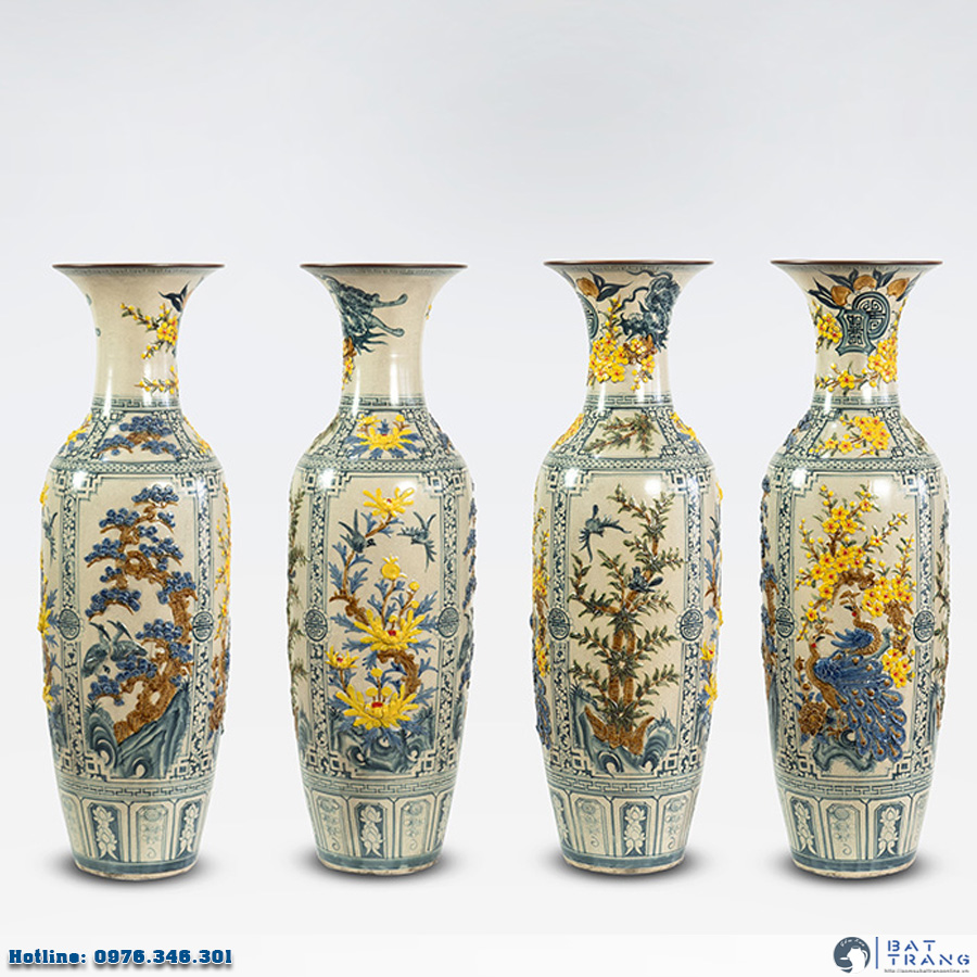 Lộc bình Tứ Quý men rạn đắp nổi số 3 cao 1m4 cao cấp Bát Tràng được các nghệ nhân hàng đầu Bát Tràng vẽ thủ công 100% với nét vẽ mềm mại dịch vụ , độc nhất và chứa đựng nhiều hình ảnh Phong thủy mang ý nghĩa tốt đẹp cho gia chủ.