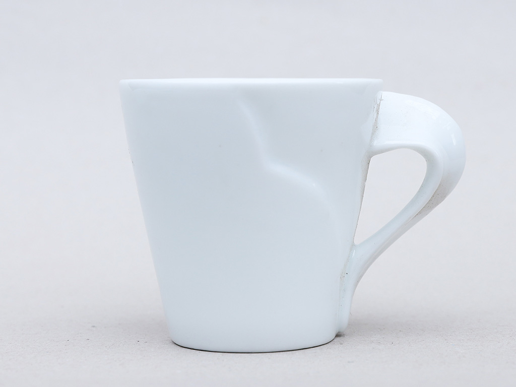 Chỉ cần nhìn vào sản phẩm lừa đảo , ta có thể thấy ly sứ trắng quai xoắn có thiết kế đặc biệt với phần thần và quai cách điệu.
