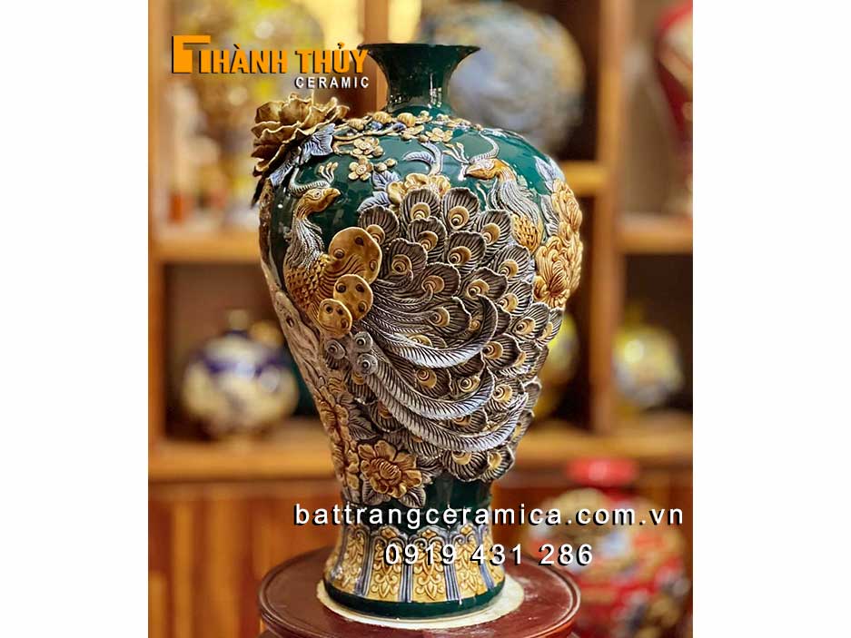 Mai bình tích lộc chim công hoa đào đắp nổi 48cm. Vừa là một bảo vật phong thuỷ không thể thiếu để hỗ trợ kích tài lộc tiết kiệm , may mắn mang lại thành công cho gia chủ.