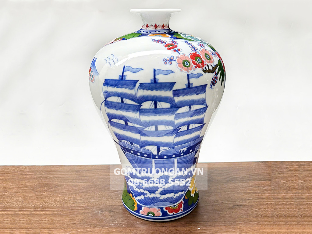 Gốm Trường An xin giới thiệu đến quý khách hàng sản phẩm Mai Bình được vẽ họa tiết Thuận Buồm Xuôi Gió Đài Loan , đây là sản phẩm đang được bán chạy nhất năm nay gần nhất . Mai bình tích lộc là một loại vật phẩm phong thủy có hình dáng tương đối giống với bình hút tài lộc shop .